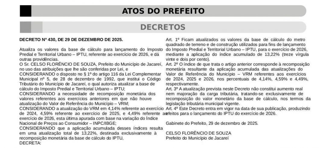 O Decreto assinado pelo prefeito Celso Florêncio (PL) que oficializa a medida foi publicado no Boletim Oficial do Município da última terça-feira (30), um dia depois de o Diário de Jacareí antecipar em reportagem exclusiva os critérios de atualização. Os valores da base de cálculo do metro quadrado de terreno e de construção são utilizados para fins de lançamento do imposto.