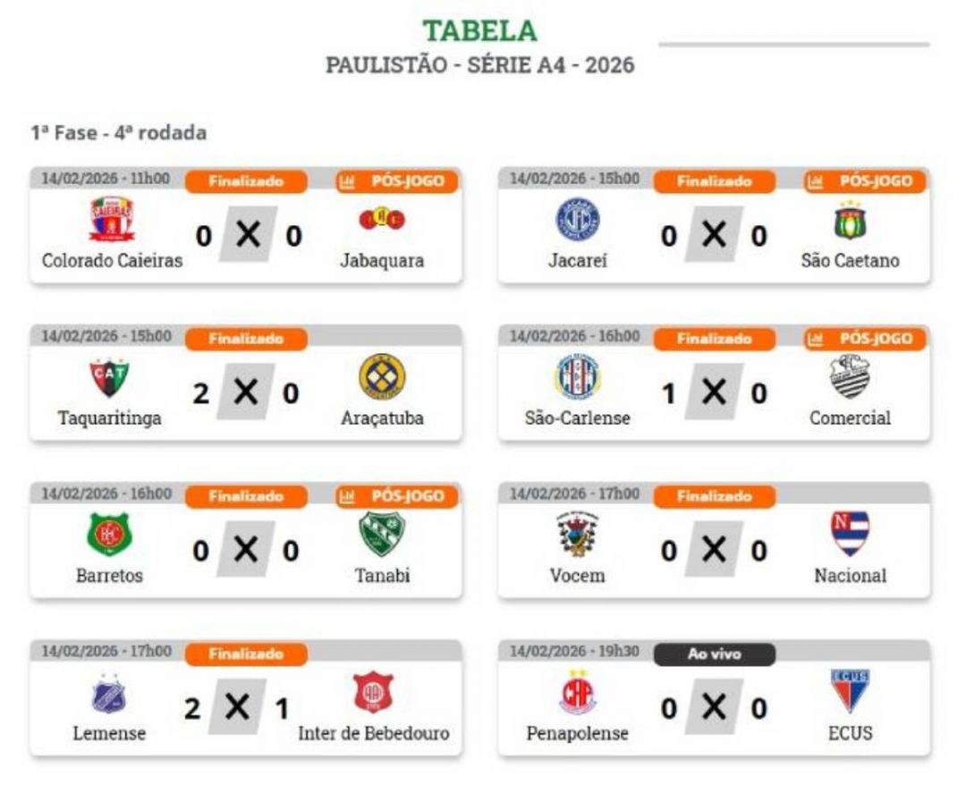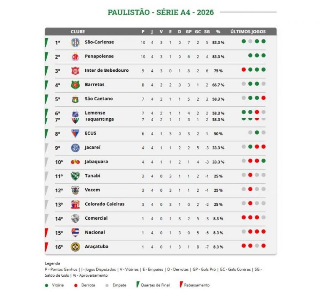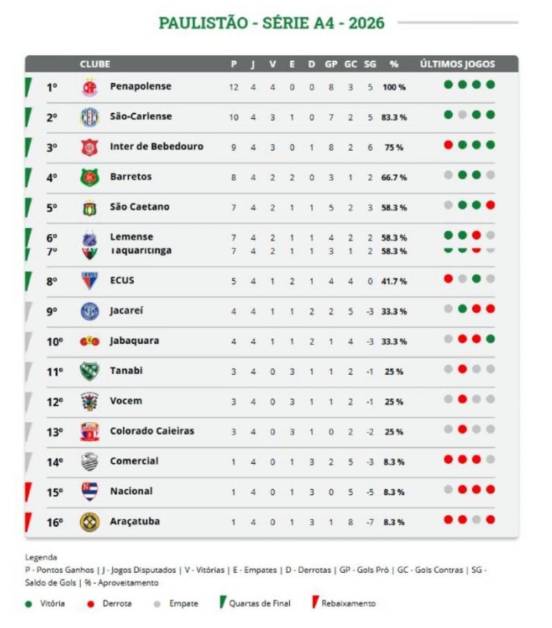 Após quatro rodadas, a Série A-4 segue equilibrada, com diferenças pequenas na pontuação e mudanças frequentes dentro do grupo dos oito primeiros colocados.