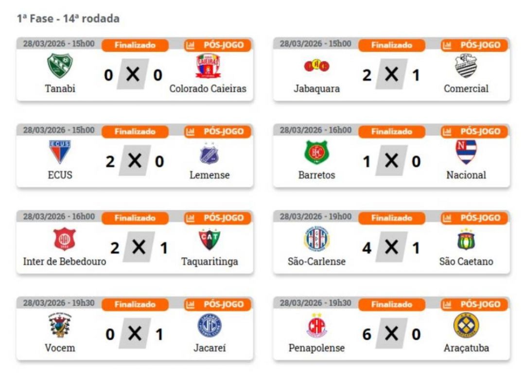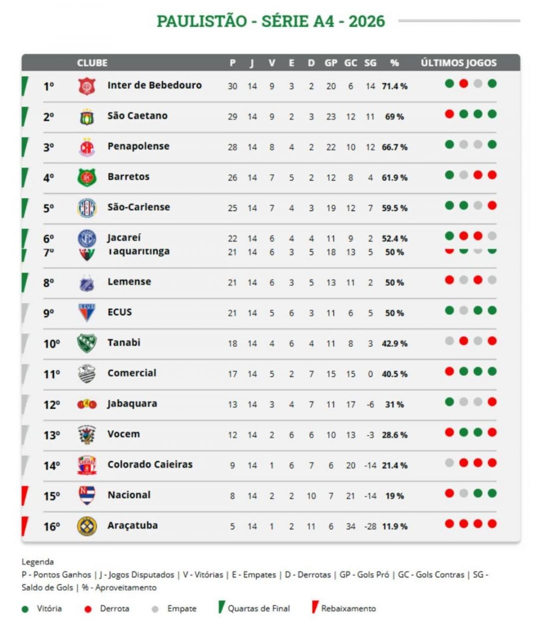 Na parte de cima, a Inter de Bebedouro segue na liderança com 30 pontos, após vencer o Taquaritinga por 2 a 1, enquanto São Caetano e Penapolense continuam próximos. Já na faixa intermediária, onde está o Jacareí, a diferença entre os times segue apertada, com várias equipes ainda com chances matemáticas de avançar.