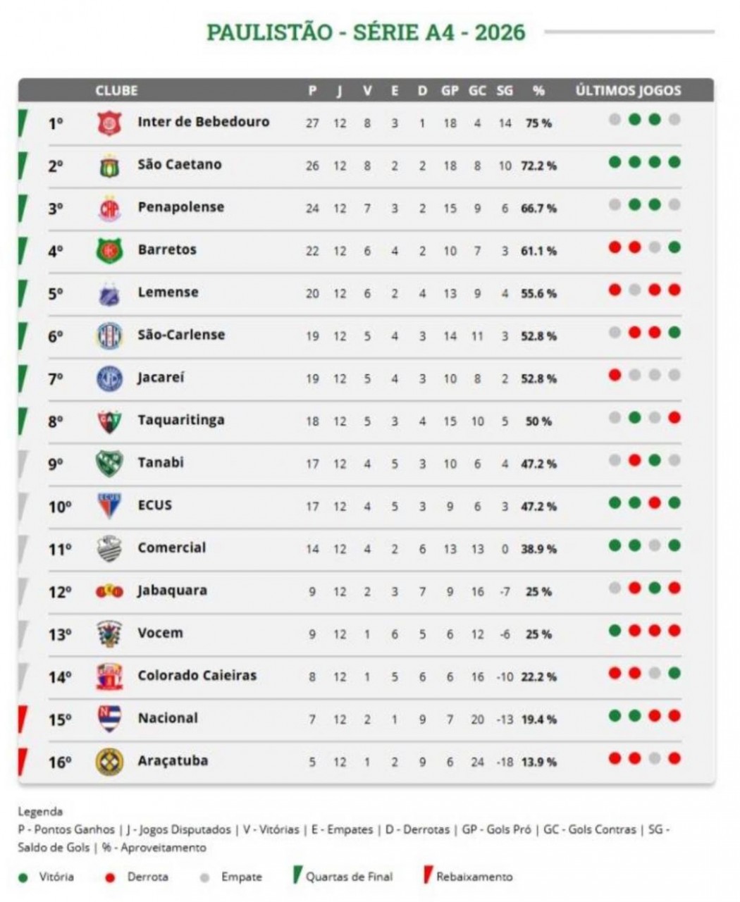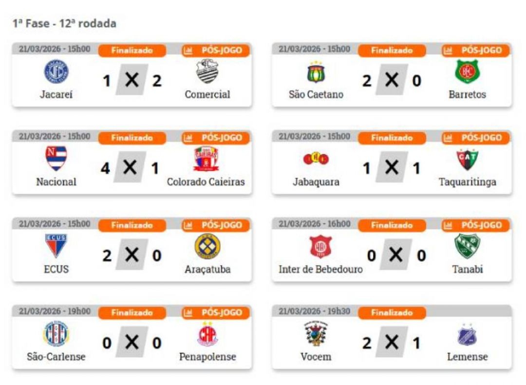 Outros resultados também impactaram o cenário: o Nacional goleou o Colorado Caieiras por 4 a 1, o ECUS venceu o Araçatuba por 2 a 0, enquanto Jabaquara e Taquaritinga empataram em 1 a 1. No complemento da rodada, o Vocem superou o Lemense por 2 a 1, embolando ainda mais a disputa pelas posições intermediárias.