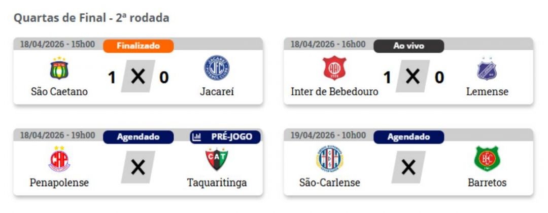 A segunda rodada das quartas de final começou neste sábado (18) e segue em aberto. Além da classificação do São Caetano, o Inter de Bebedouro venceu o Lemense por 1 a 0 no jogo de ida do confronto. Já Penapolense e Taquaritinga se enfrentam ainda neste sábado à noite.